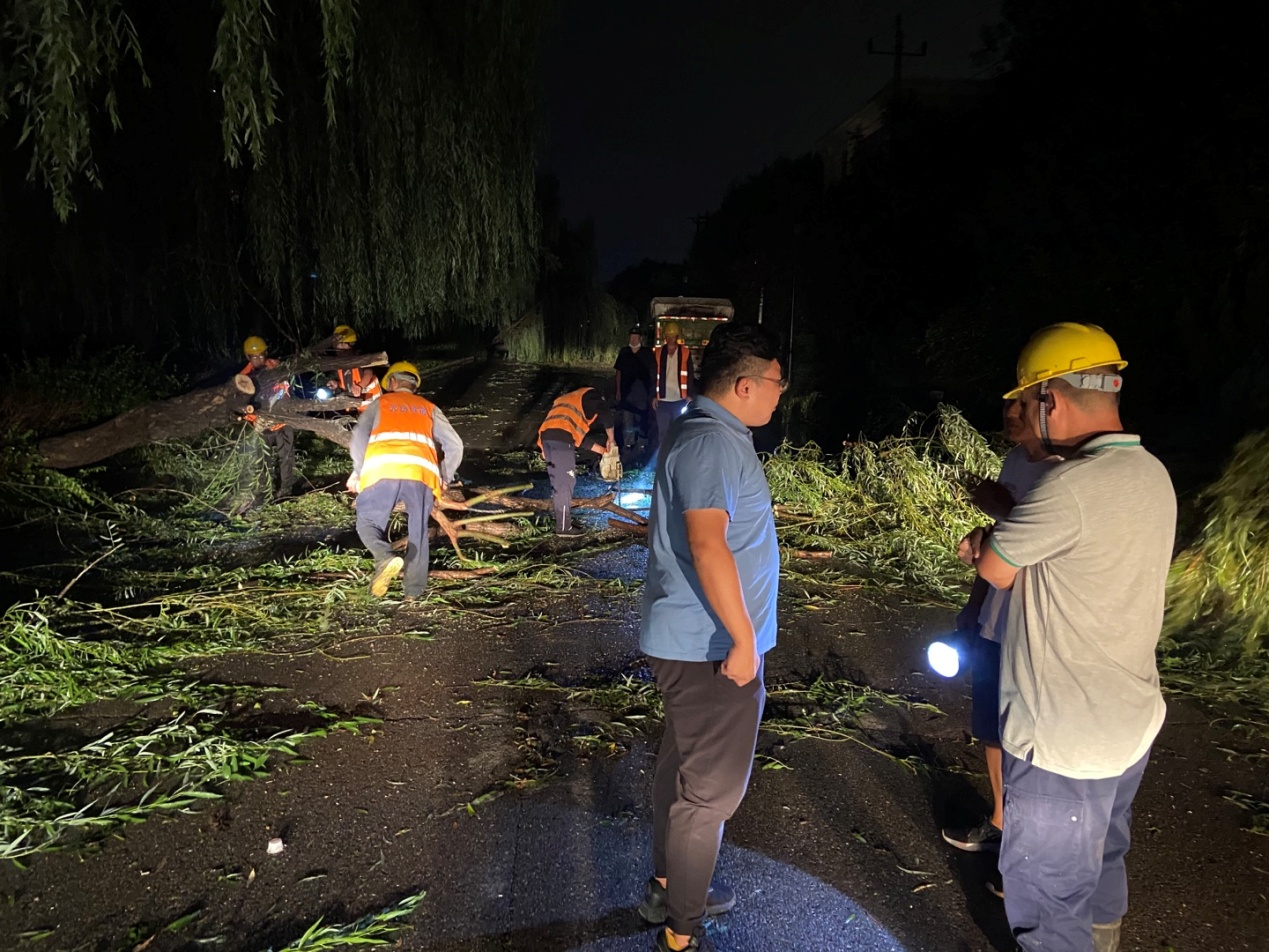 8月9日傍晚,北京顺义区遭遇雷雨大风恶劣天气,多地普降暴雨、冰雹,并伴有7、8级阵风。天房绿茵公司执勤人员第一时间发现管辖区域内出现树木损坏,树木倒伏等灾情,造成道路交通不能正常通行,并及时上报。公司迅速组织应急抢险队赶赴受灾一线进行抢险工作。