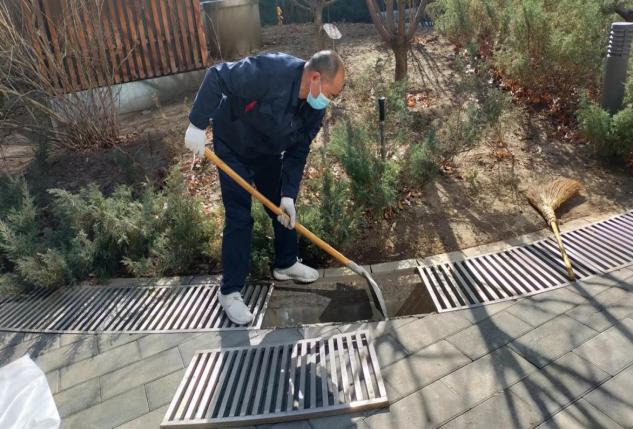 天房公司、天房市政及天房物业公司志愿者在路口进行文明引导,清理道路绿篱中的白色垃圾和雨水篦子内的堵塞垃圾。